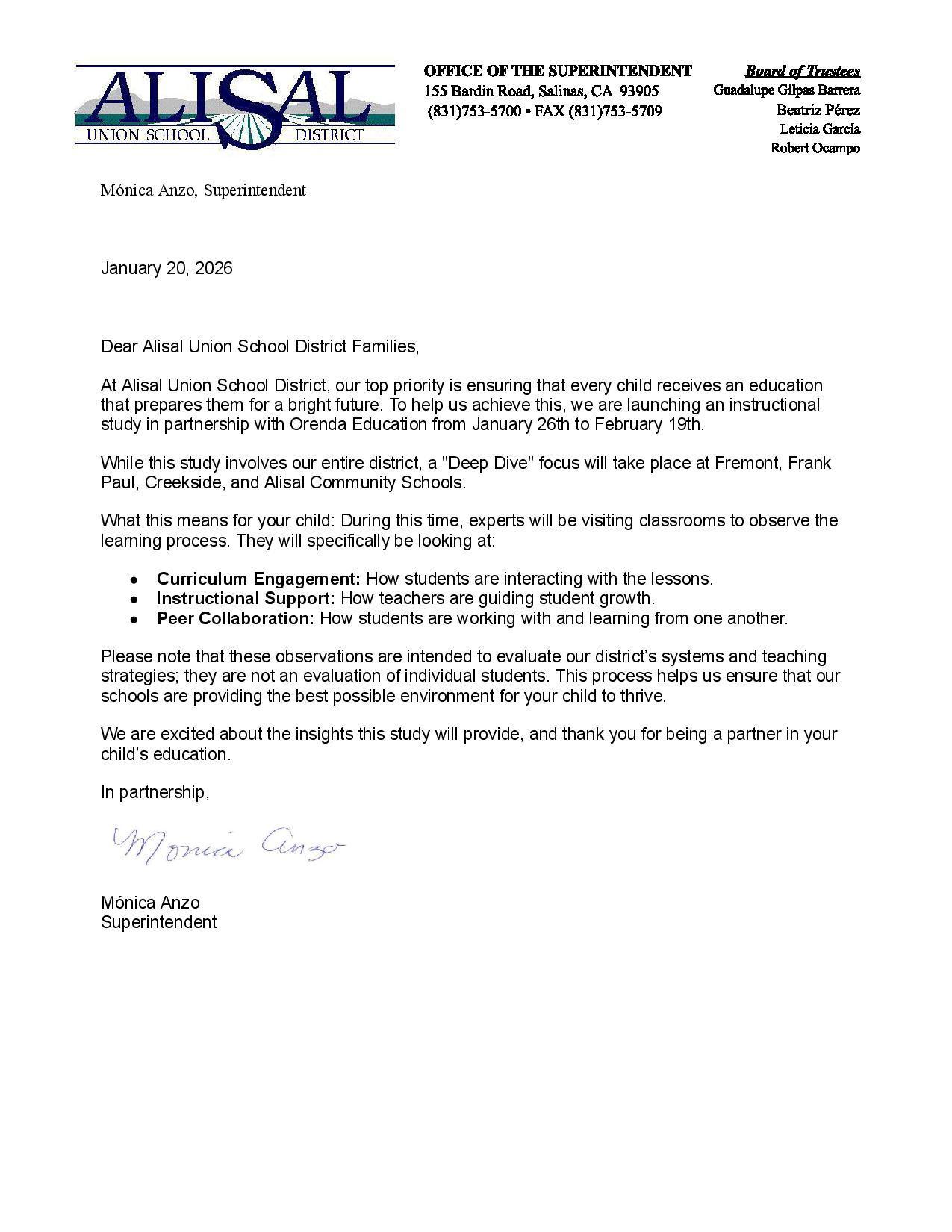 En el Distrito Escolar Alisal, nuestra máxima prioridad es asegurar que cada niño reciba una educación que lo prepare para un futuro brillante. Para ayudarnos a lograr esto, iniciaremos un estudio de la instrucción académica en asociación con Orenda Education del 26 de enero al 19 de febrero.